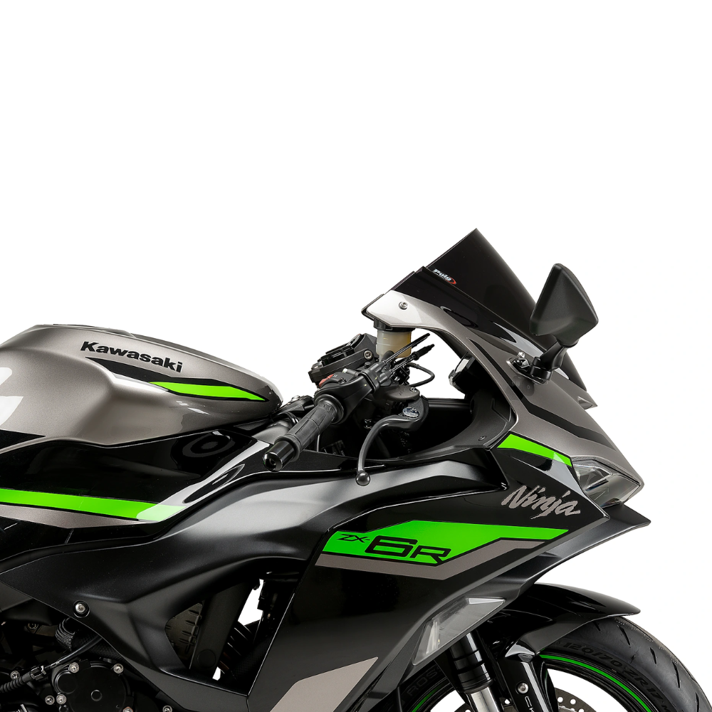 משקף PUIG מעושן כהה ל־KAWASAKI ZX-6R NINJA משפר אווירודינמיקה, מפחית עומס רוח ומעניק לאופנוע מראה ספורטיבי, חד ומרשים.
